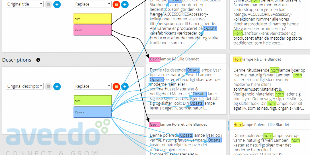 👉 You can replace, for example, “socks” with “stockings” – or “diamonds” with “gemstones” – in all texts or only selected products. The replacement function is “stackable,” meaning you can replace many things in the same individual text improvement function. It can also replace, for example, texts like “- By My Own Shop Name” – if your shopping system automatically adds this to titles or descriptions.